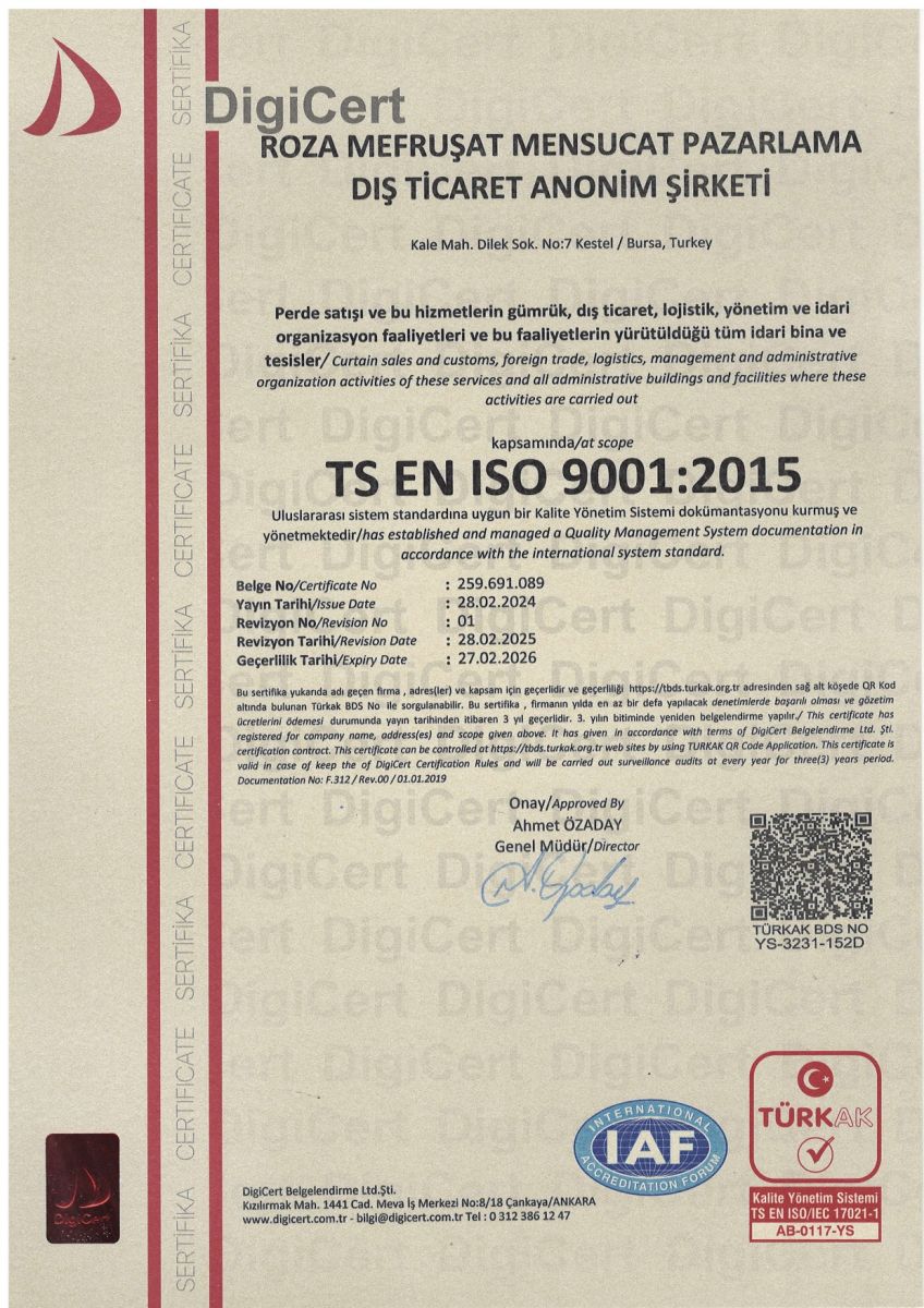 ROZA MEFRUŞAT MENSUCAT PAZARLAMA DIŞ TİCARET A.Ş. has Common Quality, Cookie, Environmental and Information Security Policies.